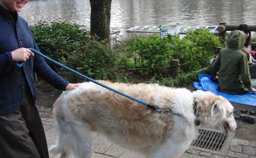 池の周りを歩いてたら、大きな犬が散歩してました。