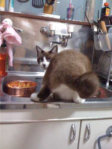でですね、魚を焼いている時からレン坊猫はコンロの周りをうろうろしてはいたのですが、焼き上がってコンロから取り出した途端