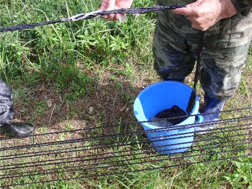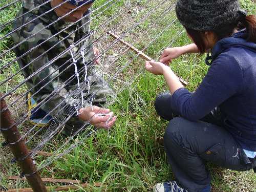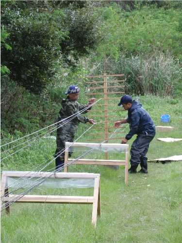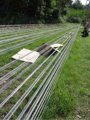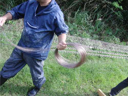 あらかじめ糊にドボドボに浸されてた糸を、ポールに掛けて行きます。