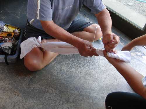 染めたいモノに柄をつけるため、糸くくり作業。