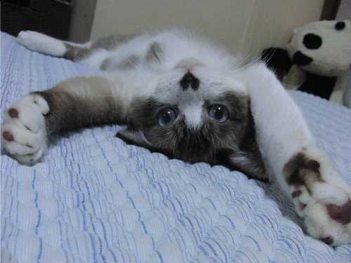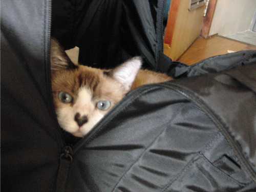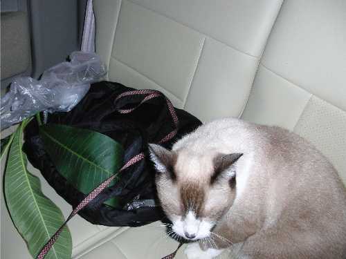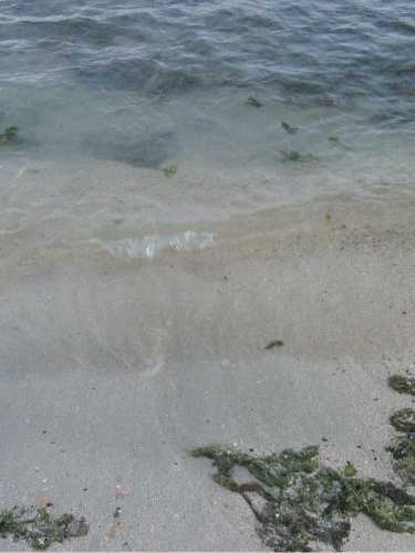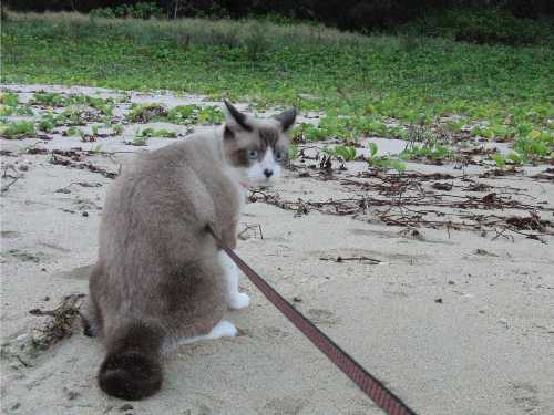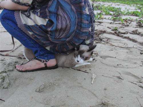 最初、猫は海が怖くて私にへばりついていたのですが、ついには自分から浜辺へ降り立ちました!