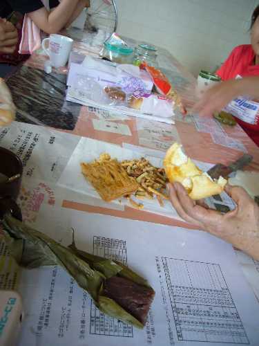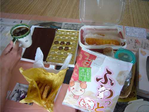 今日のおやつ:ミスドドーナッツ、かりんとう、歌舞伎あげ煎餅、かしわもち、あんぱん