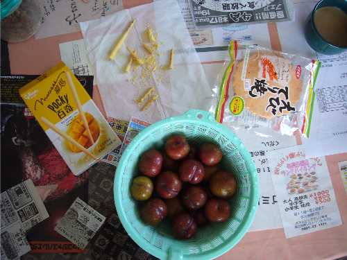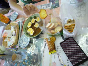 今日のおやつ:塩羊羹、きゅうりのお漬け物、100円おかし