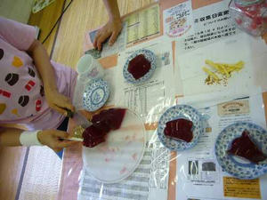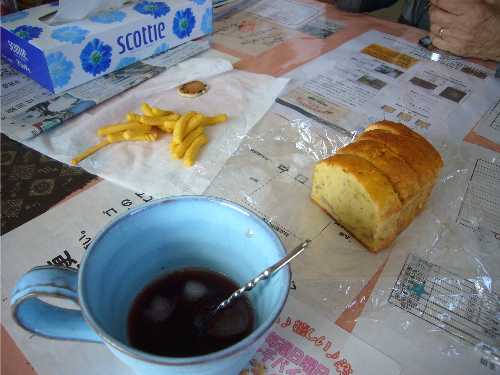 学校に帰って織りを再開して、今日は誰もおやつに立たないのか、さすがだな、と思って作業を続けていたのですが、先輩から「ゼリーがあるよv」と言われたので、皆おやつに向かいました。