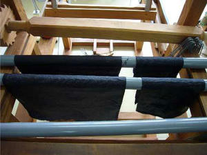 織った生地は手前の棒に巻き付けているのですが、ちょっとほどいてみました。