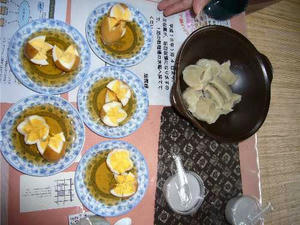 今日のおやつ:酢卵、魚入り水餃子、黒ごまプリン